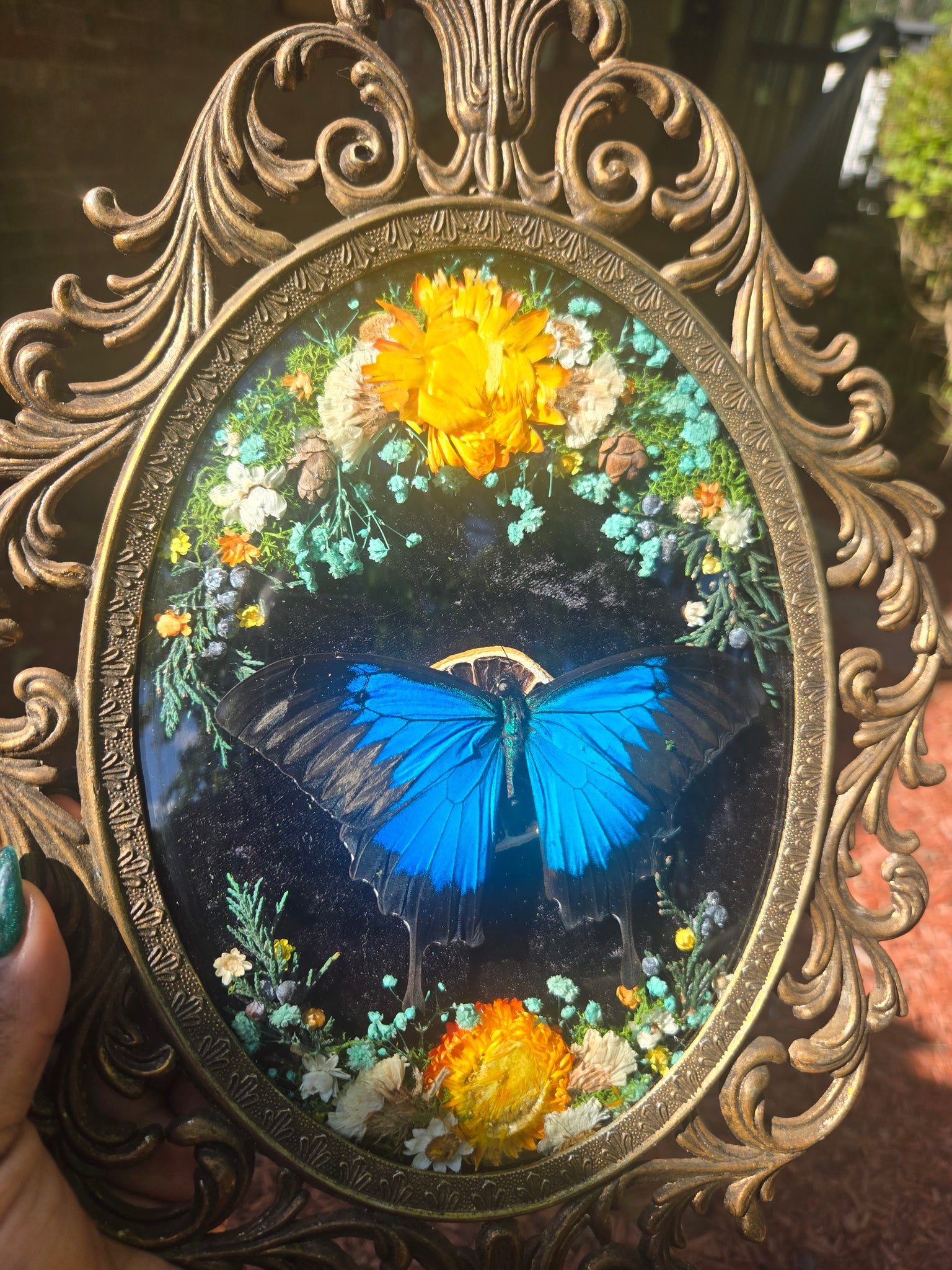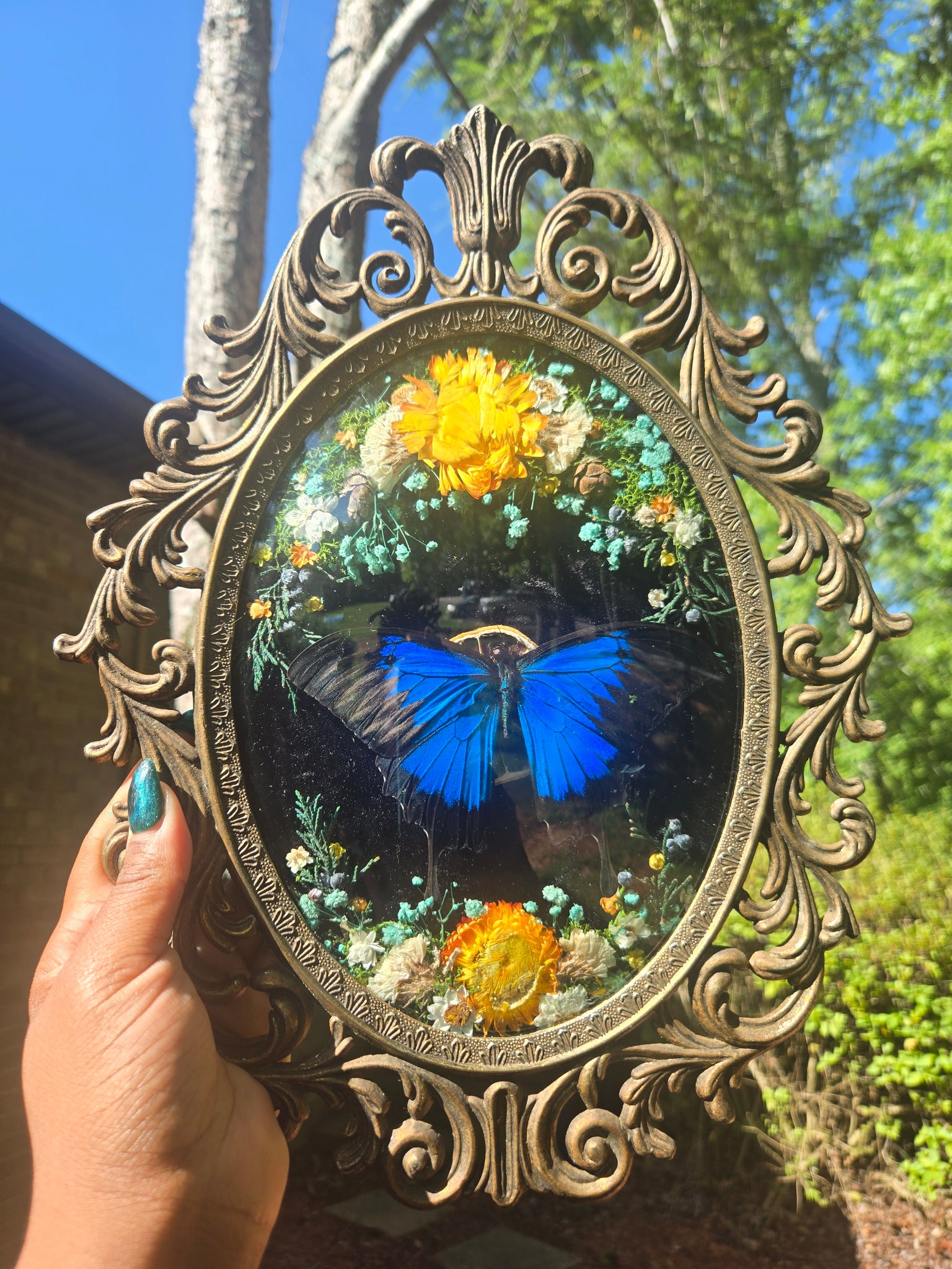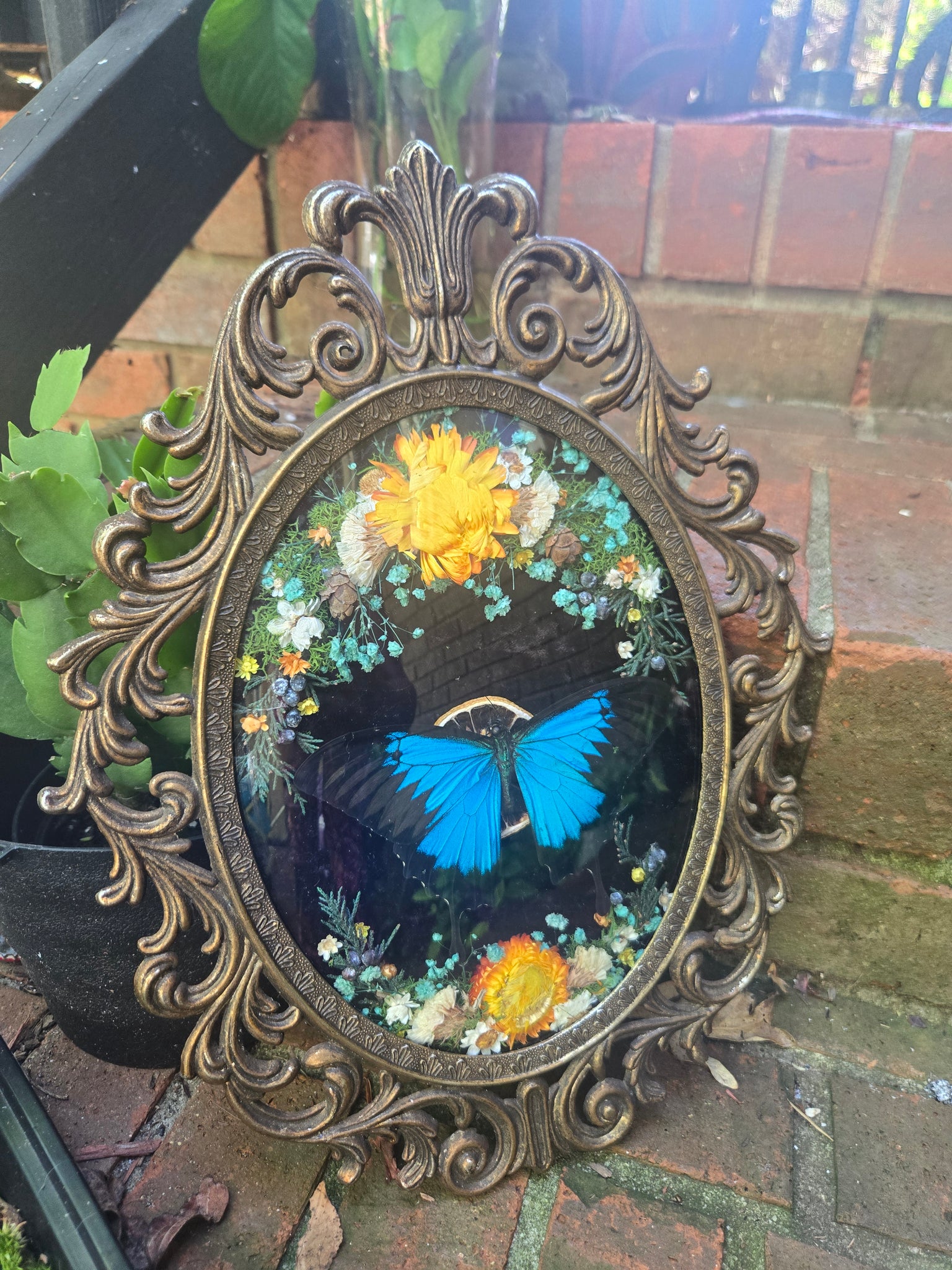 10x12 Vintage convex glass w ornate frame. Blue Mountain Swallowtail butterfly (Papilio ulysses) dried flora